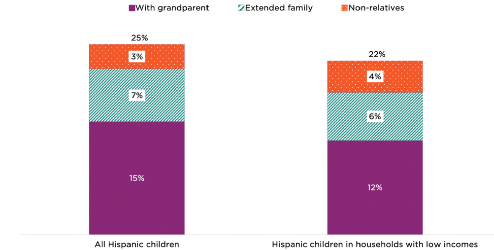 Doubling up with a grandparent is the most common among such arrangements: 15 percent of Hispanic children live with a parent and a grandparent, 7 percent live with a parent and some other extended family member, and 3 percent live with a parent and an unrelated adult. Relative to all Hispanic children, a slightly lower percentage (22%) of Hispanic children in households with low incomes are doubled-up. They are also slightly less likely to be doubled-up with a grandparent (12%) and somewhat more likely (4%) to be doubled-up with a non-relative.