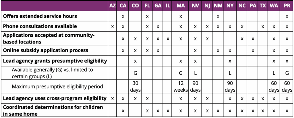 Lead agencies in states and territoriesa (hereafter referred to as “states” for simplicity) have considerable flexibility to design their own CCDF programs, including decisions about how families apply for and become enrolled in the subsidy program. Streamlined application and enrollment procedures can minimize burdens for families (and program staff) and ensure efficient services that do not interfere with parents’ employment, education, or training—activities that promote their economic self-sufficiency. Recognizing this, federal regulations require that lead agencies implement “policies that minimize disruption to parent employment, education, or training opportunities.”5