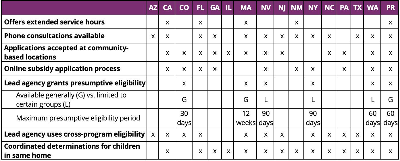 Our scan reveals considerable variation in the number and types of strategies that lead agencies in Hispanic-populous states use to reduce barriers in the subsidy application process. For example, Puerto Rico implements all seven of the strategies reviewed here, while Arizona, Illinois, and Texas implement only two or three. In addition, some lead agencies choose to apply certain strategies, like presumptive eligibility, to select priority populations only, while others report broader implementation. The practical impacts of various strategies to streamline the application and enrollment process for eligible families will depend on the specifics of how they are applied and for whom. Additional research is warranted on how such policies are implemented across state and local programs and in combination with one another.