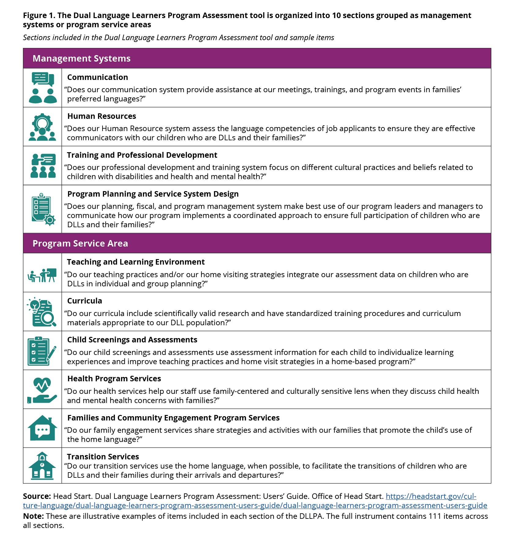 Source: Head Start. Dual Language Learners Program Assessment: Users’ Guide. Office of Head Start. https://headstart.gov/culture-language/dual-language-learners-program-assessment-users-guide/dual-language-learners-program-assessment-users-guideNote: These are illustrative examples of items included in each section of the DLLPA. The full instrument contains 111 items across all sections.